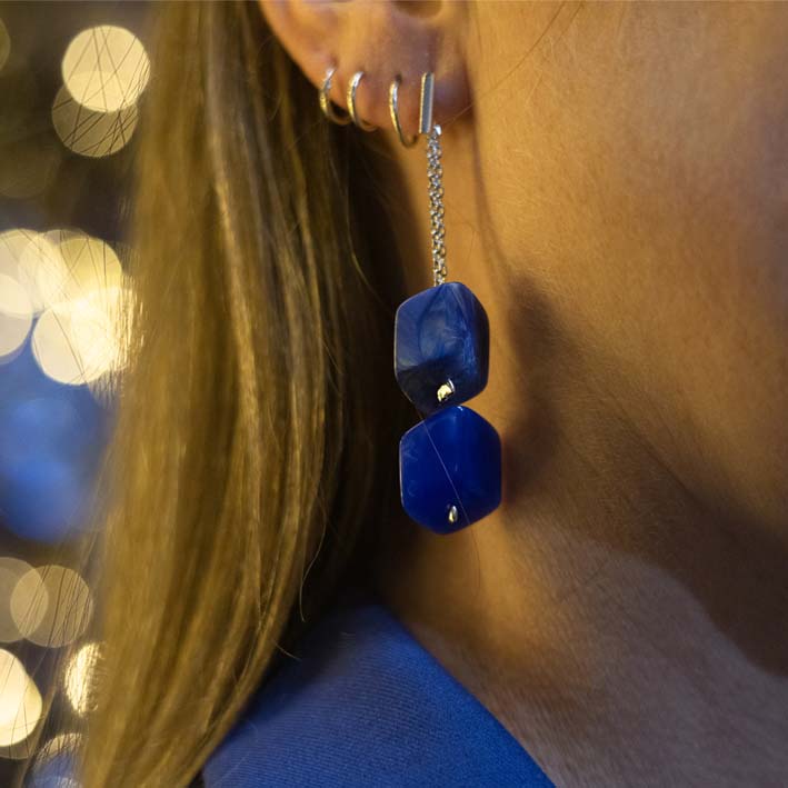 Twee Mini Cubes aan een fijn roestvrijstalen kettinkje. Lichte, moderne oorbellen die prachtig passen bij de lange ketting met 8 Mini Cubes.